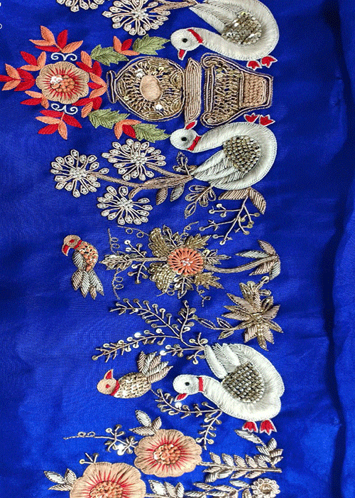 Featuring a Exclusive wedding wear saree in pure munga silk base with marodi work and metal sequins hand embellishments. It is paired with a matching blouse.